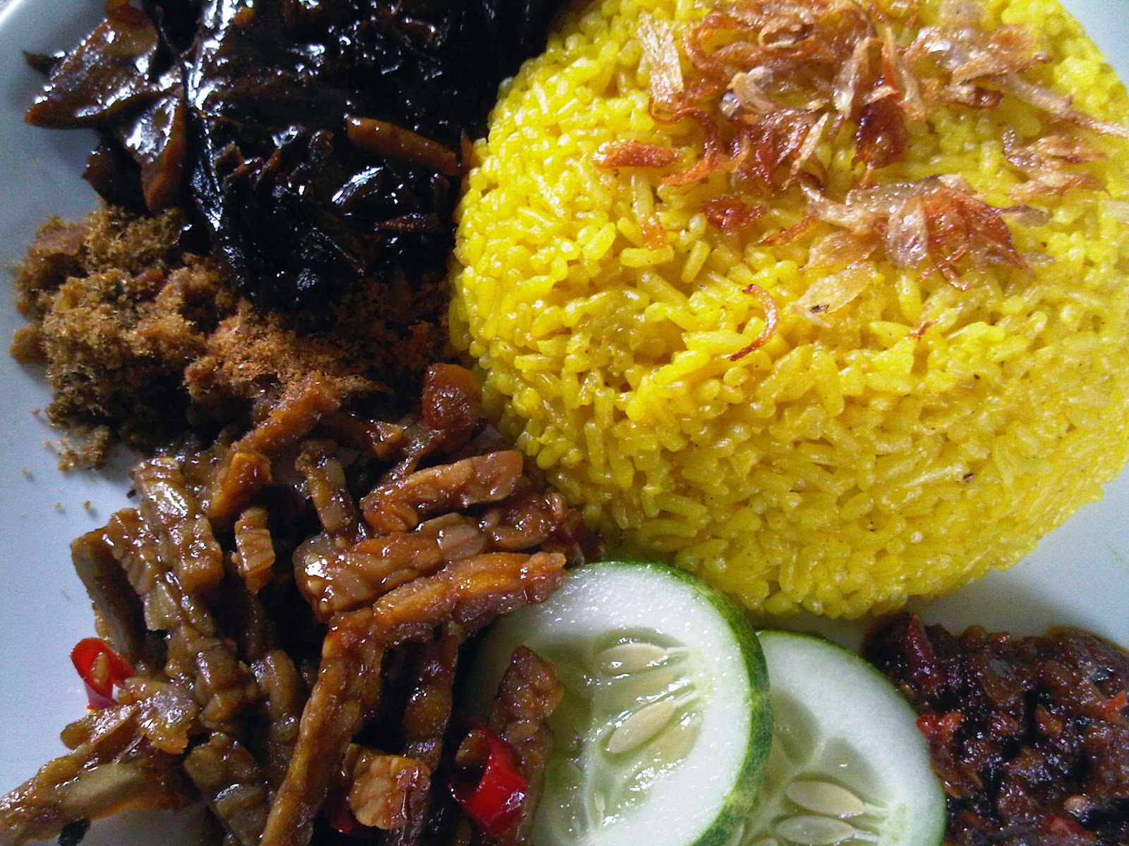 Nasi kuning identik dengan ungkapan rasa syukur atas segala nikmat yang diberi oleh Sang Maha Kuasa. Nasi kuning kerap dijumpai di seluruh Indonesia, terutama pada daerah Jawa Tenga, Yogyakarta, Banjar, Manado juga Bali. Meski dikenal luas, belum banyak yang mengetahui asal-usul dari nasi kuning tersebut. menurut sejarah, Nasi kuning berasal. 2. Nasi kuning resep rice cooker. njajan.com. Resep kedua adalah resep nasi kuning enak sekaligus resep yang paling mudah, karena menggunakan rice cooker dan tidak repot seperti resep pertama. Sebelumnya, Sedulur juga harus menyiapkan bahan-bahan, yaitu: 1 kg beras pulen. 4 cm kunyit, parut atau dihaluskan.